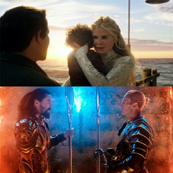 '우리 아버지는 등대지기였고 어머니는 여왕이었으니 어울리지 않는 만남이었으나 그들의 사랑이 세상을 구했고 지금의 나를 만들었다. 육지의 아들이자 바다의 왕. 심해의 수호자. 나는 Aquaman이다.'